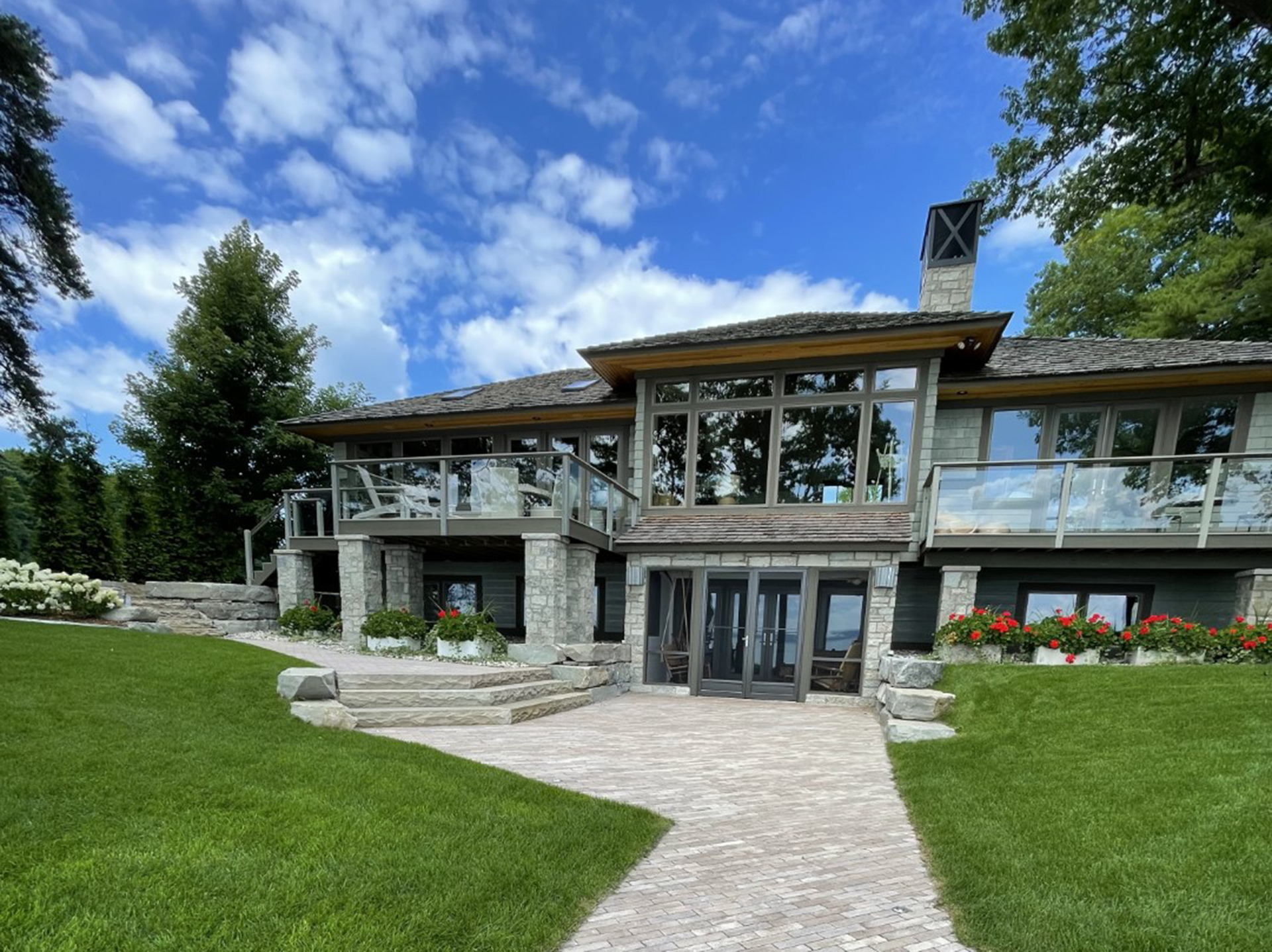 On both sides of the front entry, the homeowner imported massive pots that are filled with different annuals throughout the year showcasing the beautiful front door. We also incorporated reclaimed brick pavers imported (by the homeowner) from Europe that make up the sitting area for the lakeside fireplace and 3 seasons room. This project has been featured in numerous magazines and publications throughout Northern Michigan and we are very proud to showcase this one.